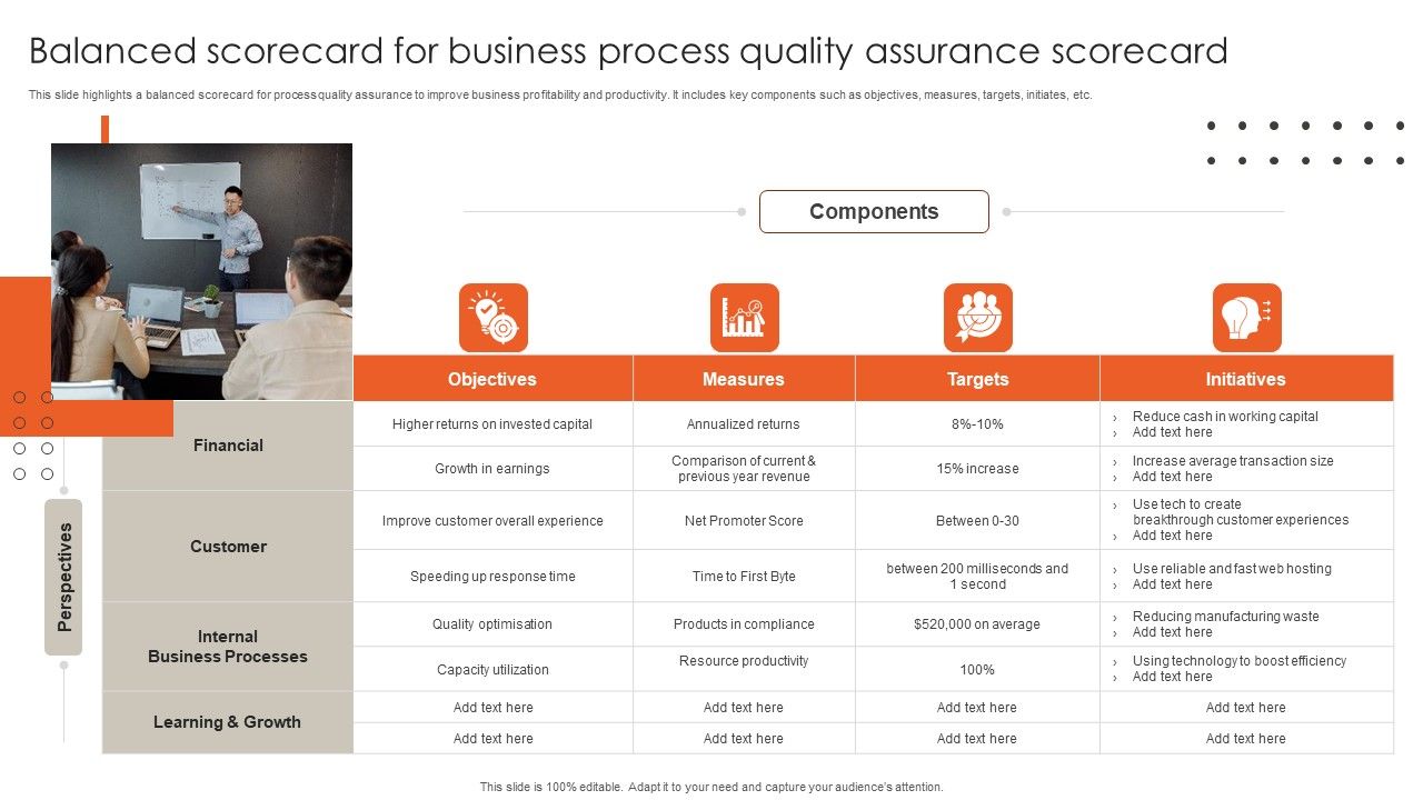 This slide highlights a balanced scorecard for process quality assurance to improve business profitability and productivity. It includes key components such as objectives, measures, targets, initiates, etc. Persuade your audience using this Balanced Scorecard For Business Process Quality Assurance Scorecard Elements PDF. This PPT design covers four stages, thus making it a great tool to use. It also caters to a variety of topics including Customer, Financial, Internal Business Processes. Download this PPT design now to present a convincing pitch that not only emphasizes the topic but also showcases your presentation skills.