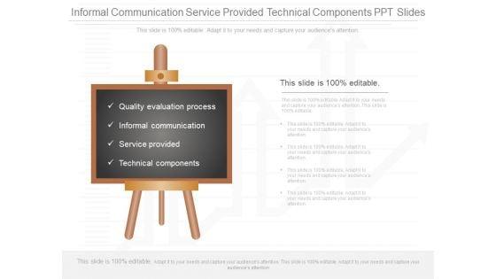 This is a informal communication service provided technical components ppt slides. This is a four stage process. The stages in this process are quality evaluation process, informal communication, service provided, technical components.