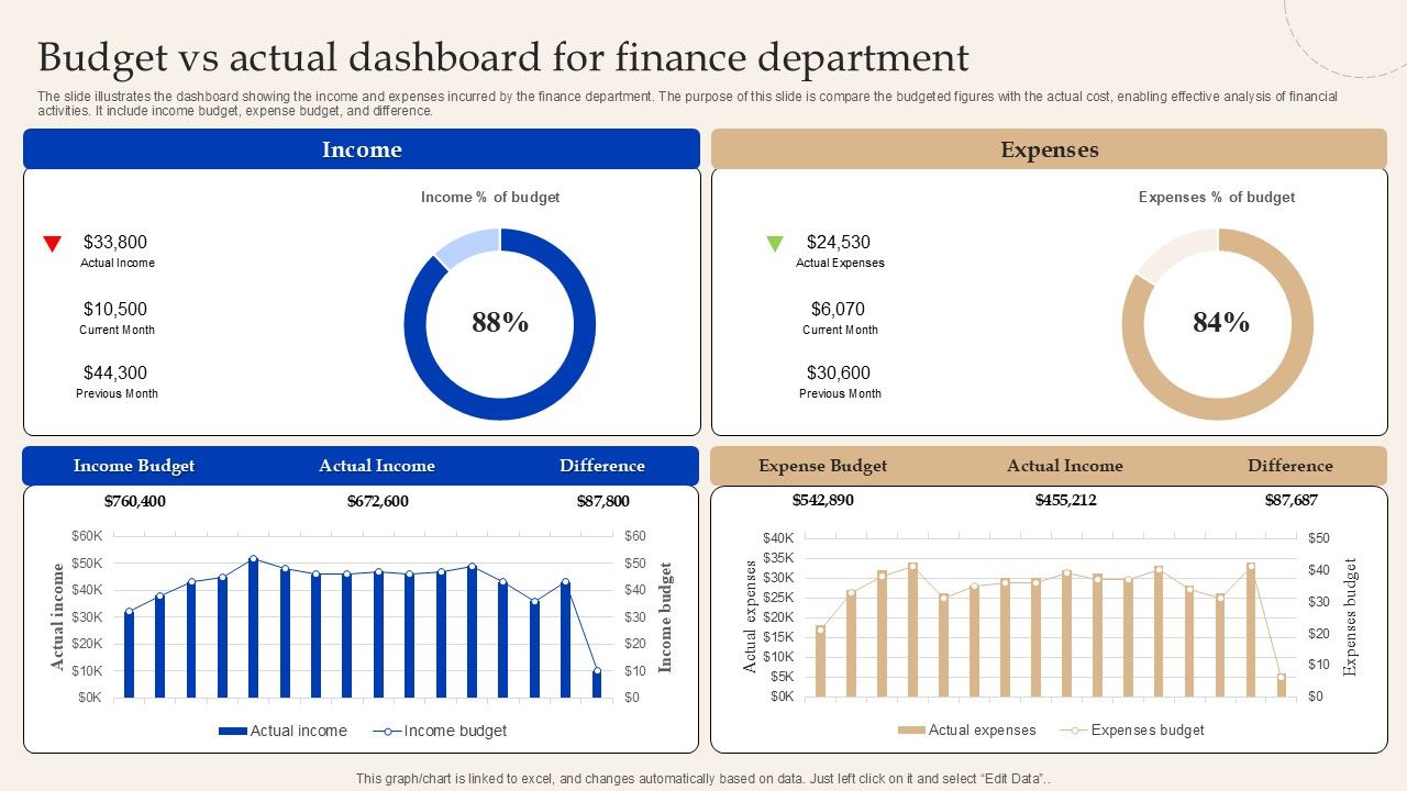 The slide illustrates the dashboard showing the income and expenses incurred by the finance department. The purpose of this slide is compare the budgeted figures with the actual cost, enabling effective analysis of financial activities. It include income budget, expense budget, and difference. Showcasing this set of slides titled Budget Vs Actual Dashboard For Finance Department Brochure PDF. The topics addressed in these templates are Income, Expenses, Expense Budget. All the content presented in this PPT design is completely editable. Download it and make adjustments in color, background, font etc. as per your unique business setting.