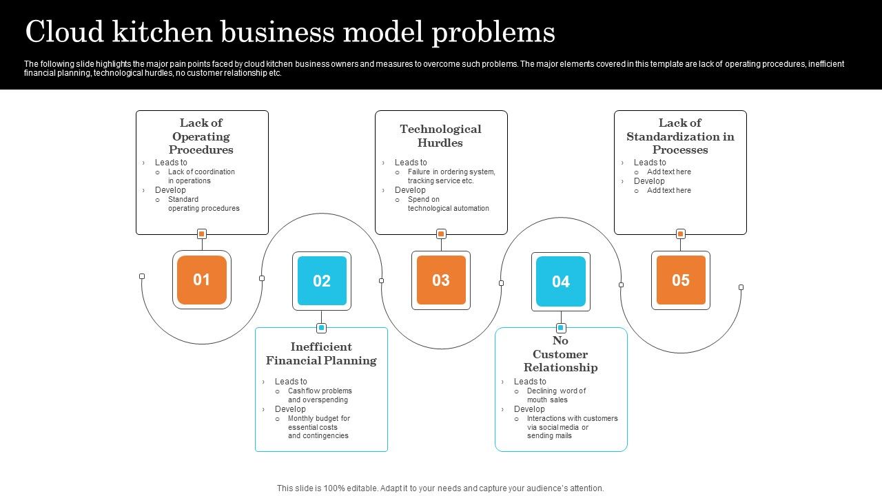 The following slide highlights the major pain points faced by cloud kitchen business owners and measures to overcome such problems. The major elements covered in this template are lack of operating procedures, inefficient financial planning, technological hurdles, no customer relationship etc. Presenting Cloud Kitchen Business Model Problems Graphics PDF to dispense important information. This template comprises five stages. It also presents valuable insights into the topics including Inefficient Financial Planning, Customer Relationship, Technological Hurdles. This is a completely customizable PowerPoint theme that can be put to use immediately. So, download it and address the topic impactfully.