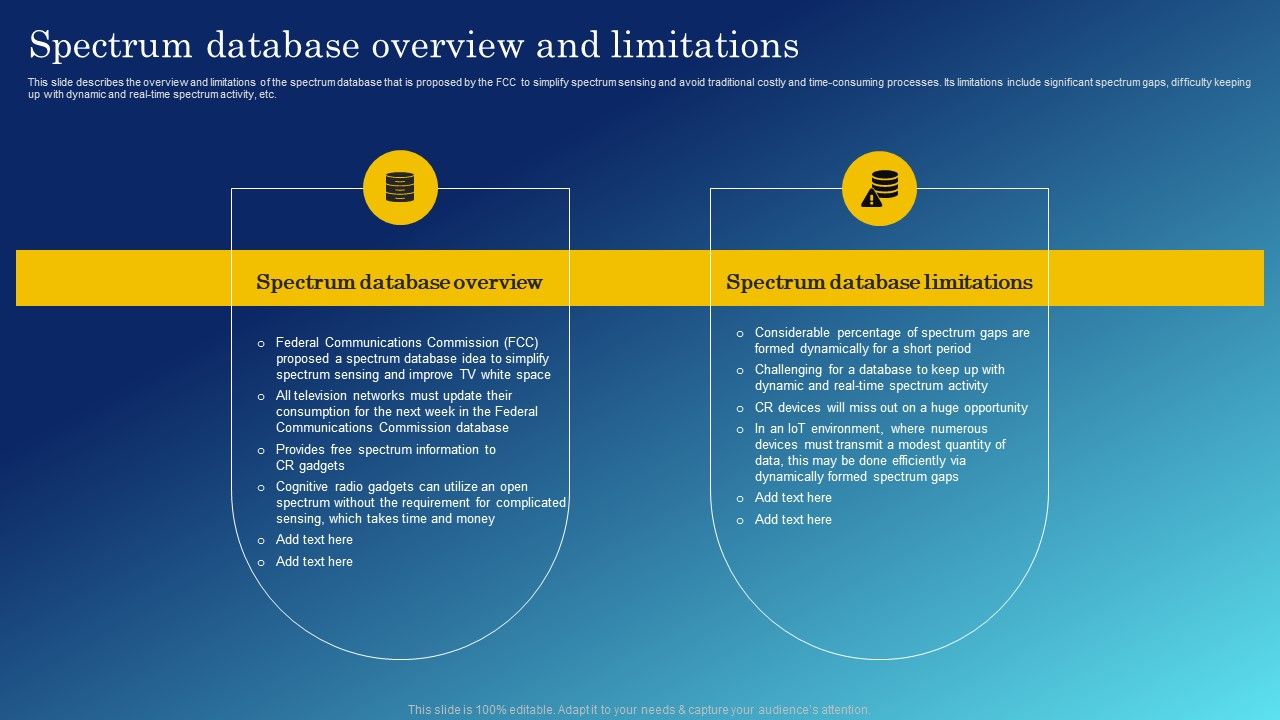 This slide describes the overview and limitations of the spectrum database that is proposed by the FCC to simplify spectrum sensing and avoid traditional costly and time-consuming processes. Its limitations include significant spectrum gaps, difficulty keeping up with dynamic and real-time spectrum activity, etc. From laying roadmaps to briefing everything in detail, our templates are perfect for you. You can set the stage with your presentation slides. All you have to do is download these easy-to-edit and customizable templates. Cognitive Sensing Innovation Spectrum Database Overview And Limitations Information PDF will help you deliver an outstanding performance that everyone would remember and praise you for. Do download this presentation today.