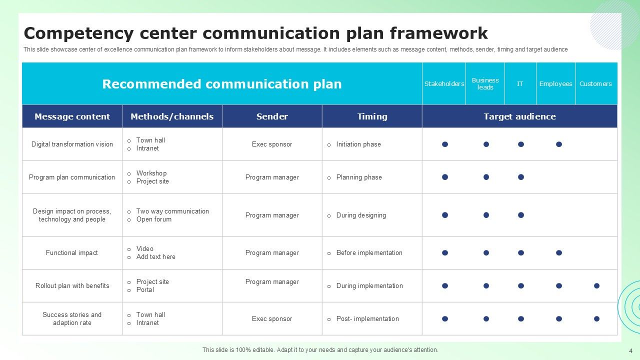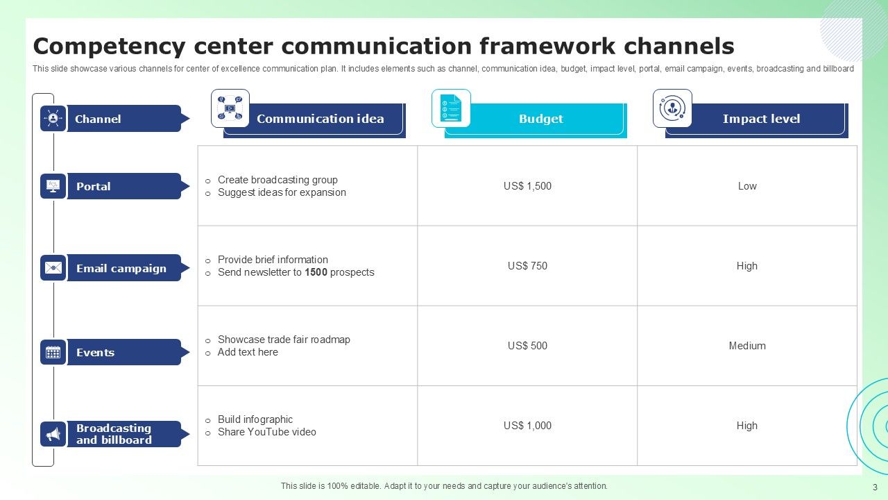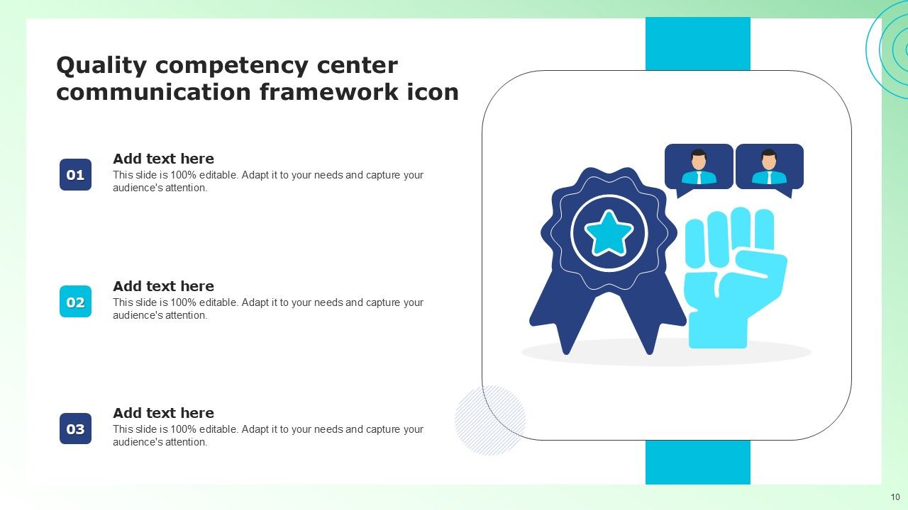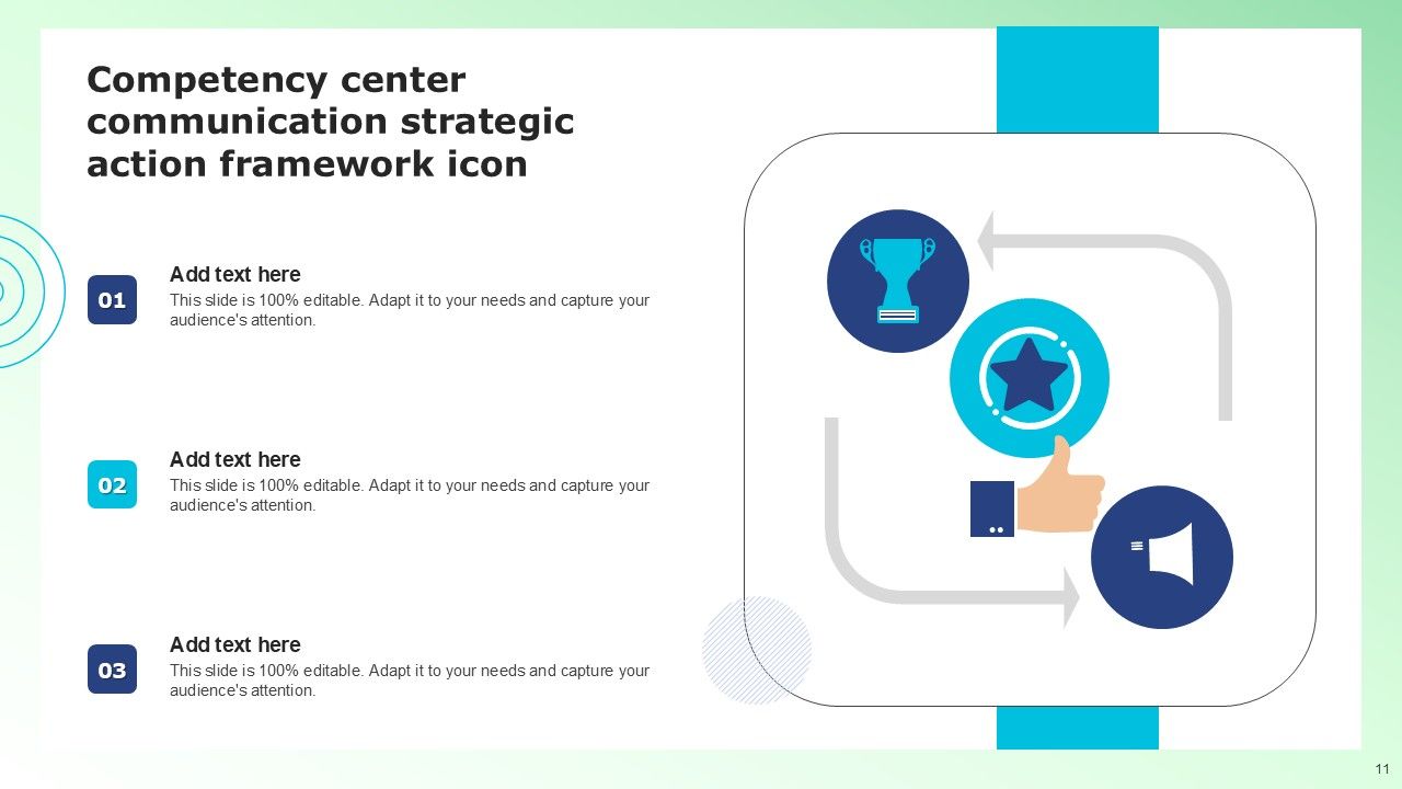 Share a great deal of information on the topic by deploying this Competency Center Communication Framework Ppt PowerPoint Presentation Complete Deck With Slides. Support your ideas and thought process with this prefabricated set. It includes a set of twelve slides, all fully modifiable and editable. Each slide can be restructured and induced with the information and content of your choice. You can add or remove large content boxes as well, to make this PPT slideshow more personalized. Its high-quality graphics and visuals help in presenting a well-coordinated pitch. This PPT template is also a resourceful tool to take visual cues from and implement the best ideas to help your business grow and expand. The main attraction of this well-formulated deck is that everything is editable, giving you the freedom to adjust it to your liking and choice. Changes can be made in the background and theme as well to deliver an outstanding pitch. Therefore, click on the download button now to gain full access to this multifunctional set.