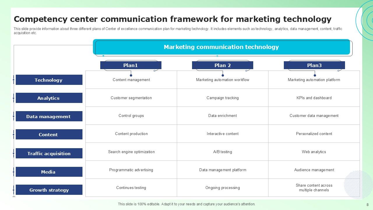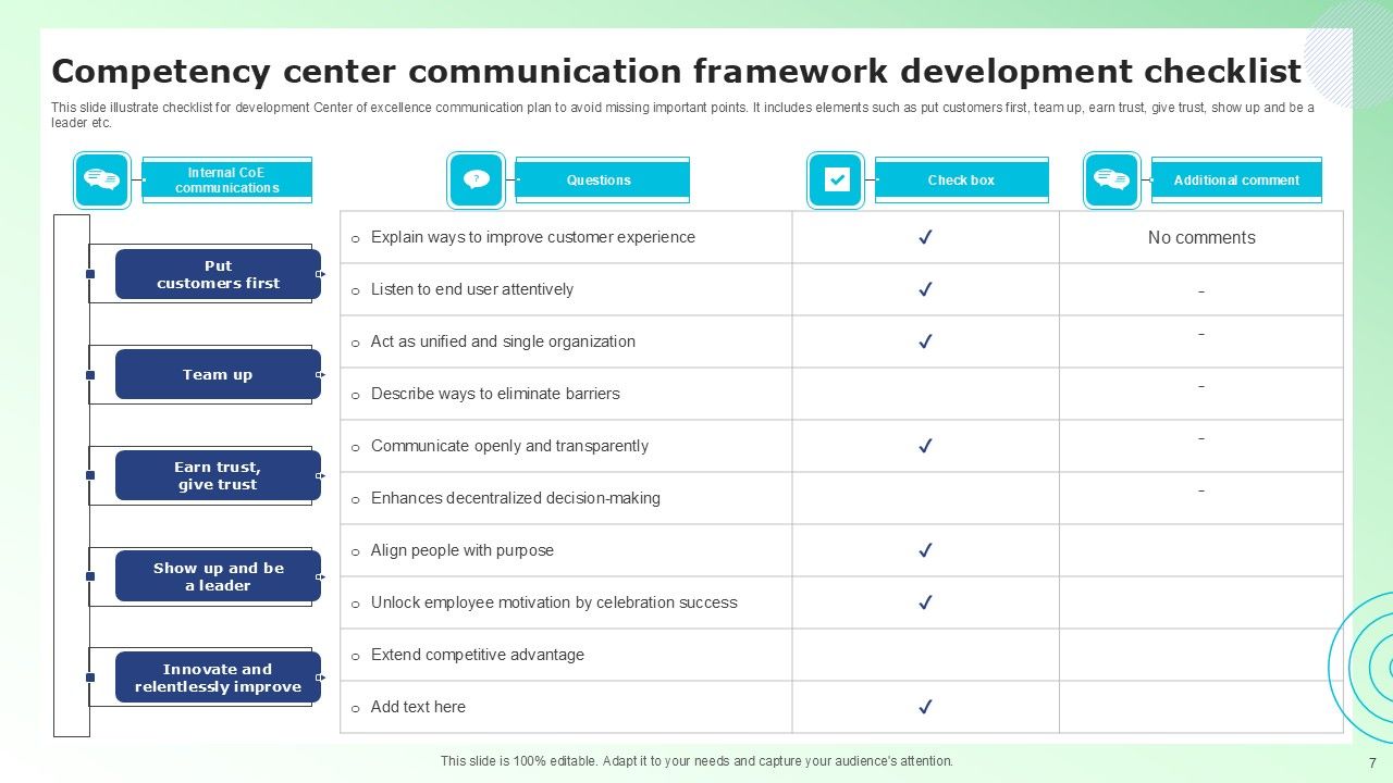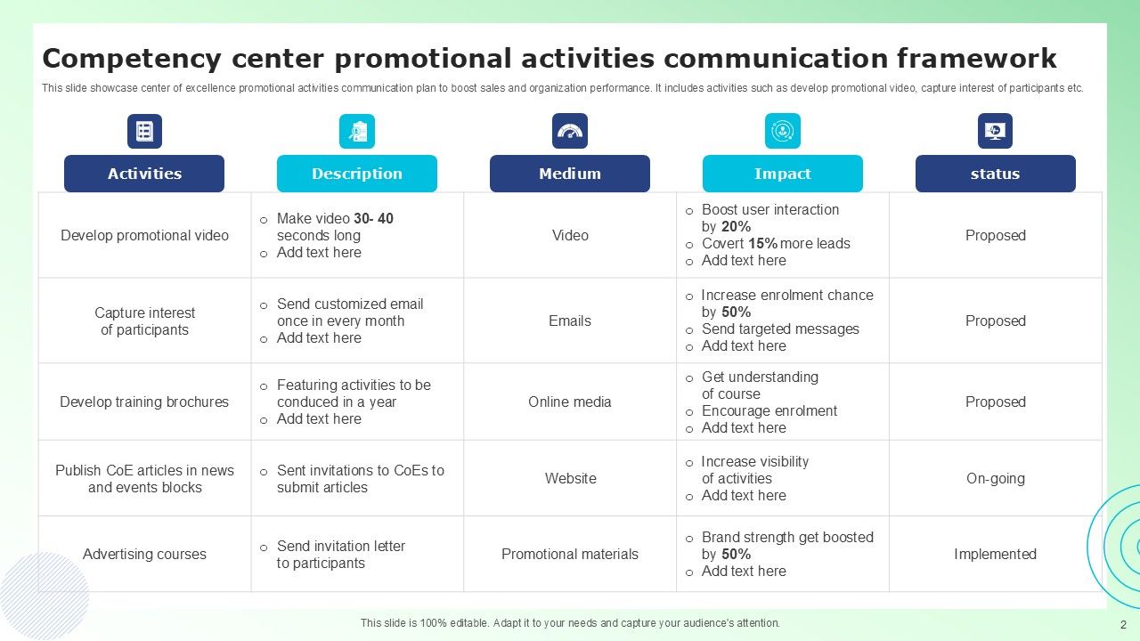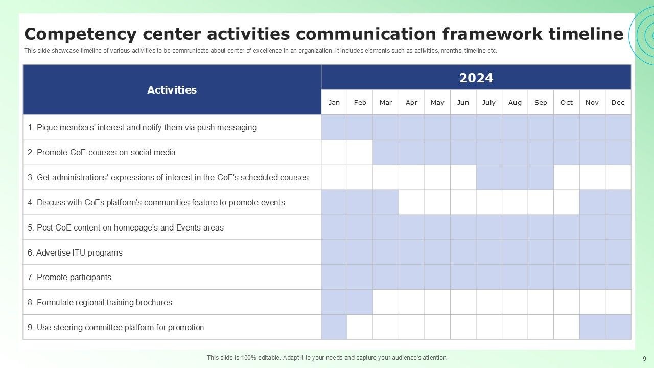 Share a great deal of information on the topic by deploying this Competency Center Communication Framework Ppt PowerPoint Presentation Complete Deck With Slides. Support your ideas and thought process with this prefabricated set. It includes a set of twelve slides, all fully modifiable and editable. Each slide can be restructured and induced with the information and content of your choice. You can add or remove large content boxes as well, to make this PPT slideshow more personalized. Its high-quality graphics and visuals help in presenting a well-coordinated pitch. This PPT template is also a resourceful tool to take visual cues from and implement the best ideas to help your business grow and expand. The main attraction of this well-formulated deck is that everything is editable, giving you the freedom to adjust it to your liking and choice. Changes can be made in the background and theme as well to deliver an outstanding pitch. Therefore, click on the download button now to gain full access to this multifunctional set.