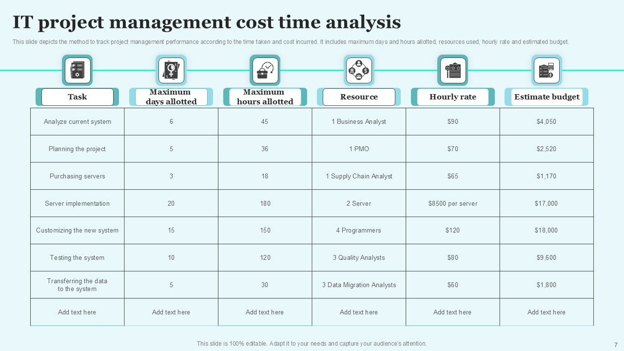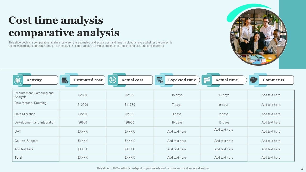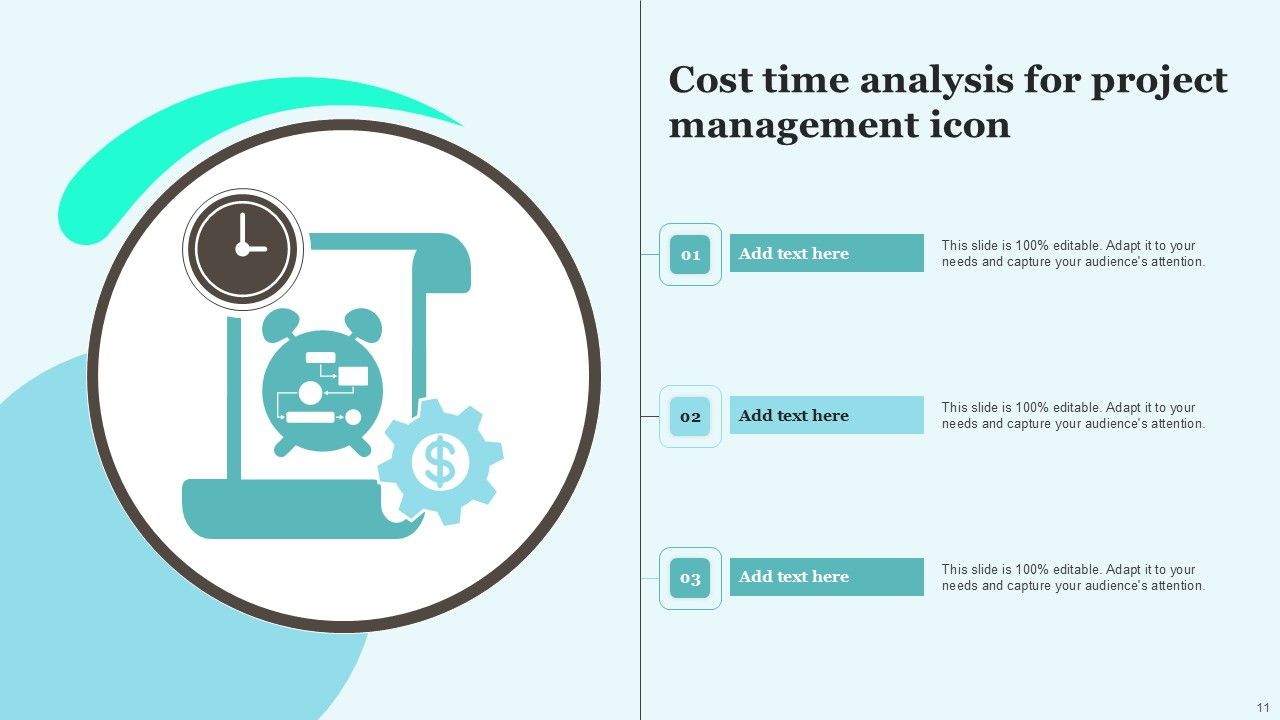 Improve your presentation delivery using this Cost Time Analysis Ppt PowerPoint Presentation Complete Deck With Slides. Support your business vision and objectives using this well-structured PPT deck. This template offers a great starting point for delivering beautifully designed presentations on the topic of your choice. Comprising twelve this professionally designed template is all you need to host discussion and meetings with collaborators. Each slide is self-explanatory and equipped with high-quality graphics that can be adjusted to your needs. Therefore, you will face no difficulty in portraying your desired content using this PPT slideshow. This PowerPoint slideshow contains every important element that you need for a great pitch. It is not only editable but also available for immediate download and utilization. The color, font size, background, shapes everything can be modified to create your unique presentation layout. Therefore, download it now.