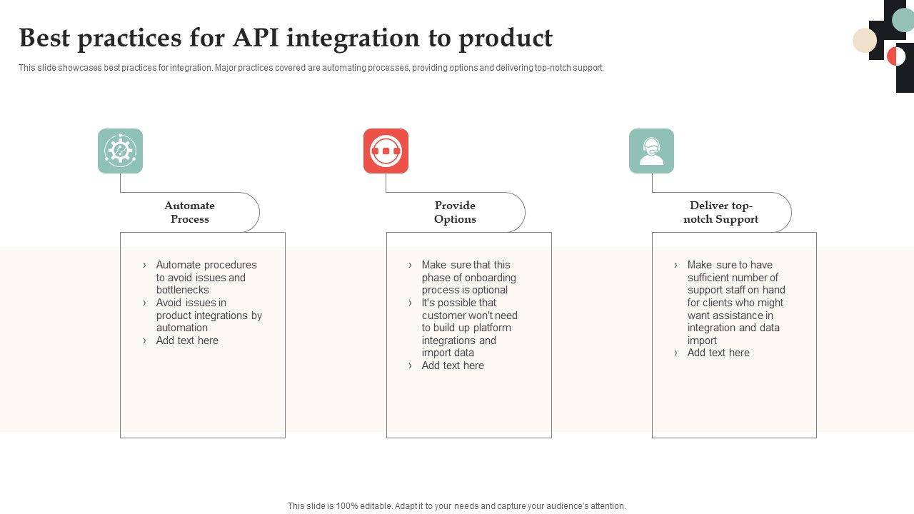 This slide showcases best practices for integration. Major practices covered are automating processes, providing options and delivering top-notch support. Are you in need of a template that can accommodate all of your creative concepts This one is crafted professionally and can be altered to fit any style. Use it with Google Slides or PowerPoint. Include striking photographs, symbols, depictions, and other visuals. Fill, move around, or remove text boxes as desired. Test out color palettes and font mixtures. Edit and save your work, or work with colleagues. Download Customer Onboarding Journey Optimization Plan Best Practices For Api Integration To Product Sample PDF and observe how to make your presentation outstanding. Give an impeccable presentation to your group and make your presentation unforgettable.