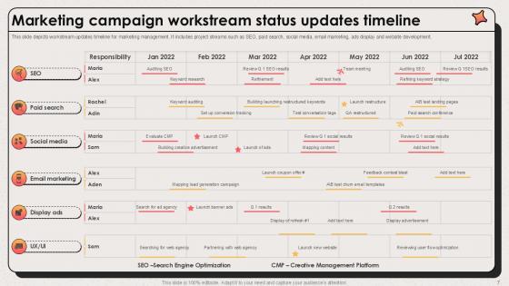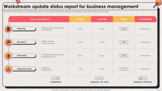 This Project Status, Deliverables, Status Report, Update Timeline, Members Workstream-slide Workstream Updates Powerpoint Ppt Template Bundles is your content ready tool to impress the stakeholders with your business planning and its manner of execution. Showcase your ideas and how you plan to make them real in detail with this PPT Template Bundle. The slides have the conceptual bandwidth to present the crucial aspects of your plan, such as funding, marketing, resource allocation, timeline, roadmap, and more. When you present your plans with this PPT Layout, the stakeholders are sure to come on board because you will be able to present a succinct, thought-out, winning project. Download this Complete Deck now to take control into your hands. The 100 percent customizable offer is just too good to be resisted.
