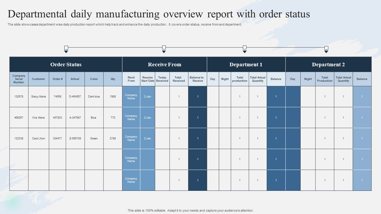 The slide showcases department wise daily production report which help track and enhance the daily production . It covers order status, receive from and department. Showcasing this set of slides titled Departmental Daily Manufacturing Overview Report With Order Status Microsoft PDF. The topics addressed in these templates are Order Status, Departmental, Overview. All the content presented in this PPT design is completely editable. Download it and make adjustments in color, background, font etc. as per your unique business setting.