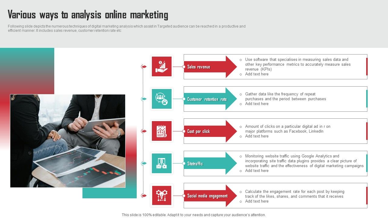 Following slide depicts the numerous techniques of digital marketing analysis which assist in Targeted audience can be reached in a productive and efficient manner. It includes sales revenue, customer retention rate etc. Presenting Various Ways To Analysis Online Marketing Introduction PDF to dispense important information. This template comprises five stages. It also presents valuable insights into the topics including Sales Revenue, Customer Retention Rate, Cost Per Click. This is a completely customizable PowerPoint theme that can be put to use immediately. So, download it and address the topic impactfully.