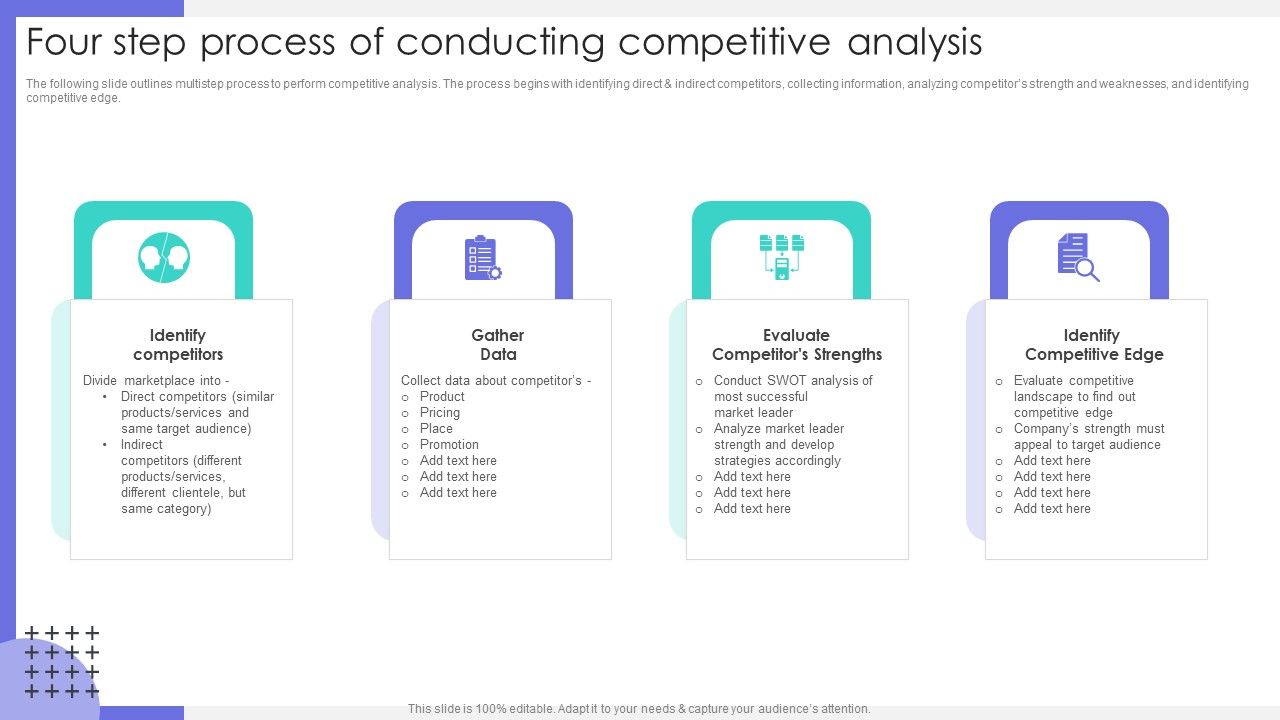 The following slide outlines multistep process to perform competitive analysis. The process begins with identifying direct and indirect competitors, collecting information, analyzing competitors strength and weaknesses, and identifying competitive edge. There are so many reasons you need a Four Step Process Of Conducting Competitive Analysis Ppt Outline Visuals PDF. The first reason is you can not spend time making everything from scratch, Thus, Slidegeeks has made presentation templates for you too. You can easily download these templates from our website easily.