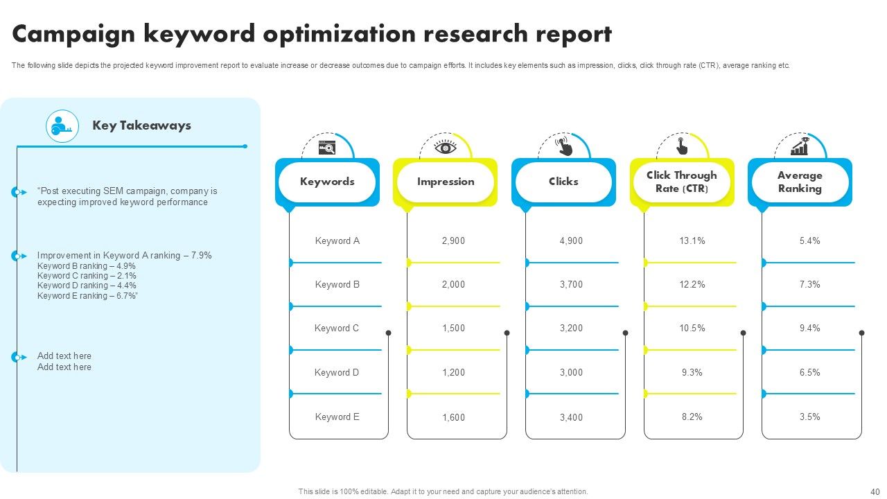 With well-researched insights and carefully-constructed design, this Implementing PPC Marketing Strategies To Increase Conversion Ppt PowerPoint Presentation Complete Deck With Slides is all that you need for your next business meeting with clients and win them over. Add your data to graphs, charts, and tables that are already ready to display it with stunning visuals and help your audience recall your work. With this PPT Complete Deck, you will be able to display your knowledge of the subject as well as your skills as a communicator. Share your ideas and make an impact on the audience with this PowerPoint Layout and ensure that you are known as a presentation professional. Download this PPT Template Bundle to create the most interesting presentation anyone has ever seen.