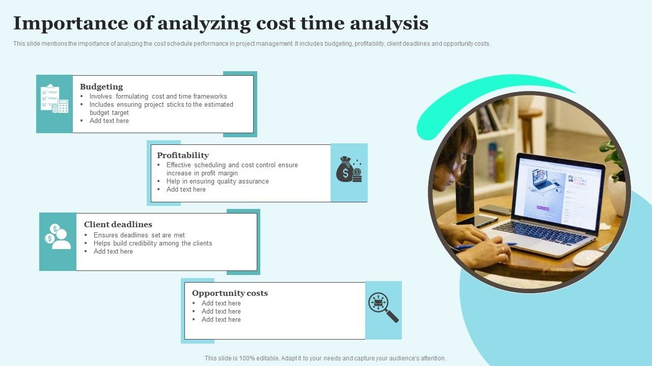 This slide mentions the importance of analyzing the cost schedule performance in project management. It includes budgeting, profitability, client deadlines and opportunity costs. Presenting Importance Of Analyzing Cost Time Analysis Elements PDF to dispense important information. This template comprises four stages. It also presents valuable insights into the topics including Profitability, Client Deadlines, Opportunity Costs. This is a completely customizable PowerPoint theme that can be put to use immediately. So, download it and address the topic impactfully.