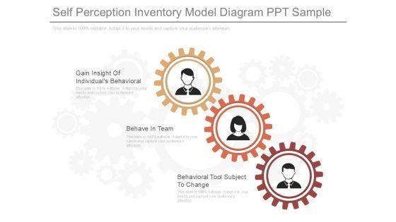 This is a self perception inventory model diagram ppt sample. This is a three stage process. The stages in this process are gain insight of individuals behavioral, behave in team, behavioral tool subject to change.