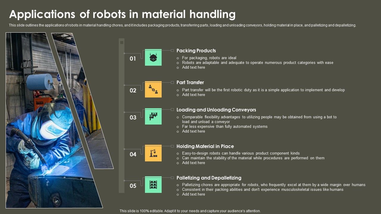 This slide outlines the applications of robots in material handling chores, and it includes packaging products, transferring parts, loading and unloading conveyors, holding material in place, and palletizing and depalletizing. There are so many reasons you need a Iot Integration In Manufacturing Applications Of Robots In Material Handling Topics PDF. The first reason is you can not spend time making everything from scratch, Thus, Slidegeeks has made presentation templates for you too. You can easily download these templates from our website easily.