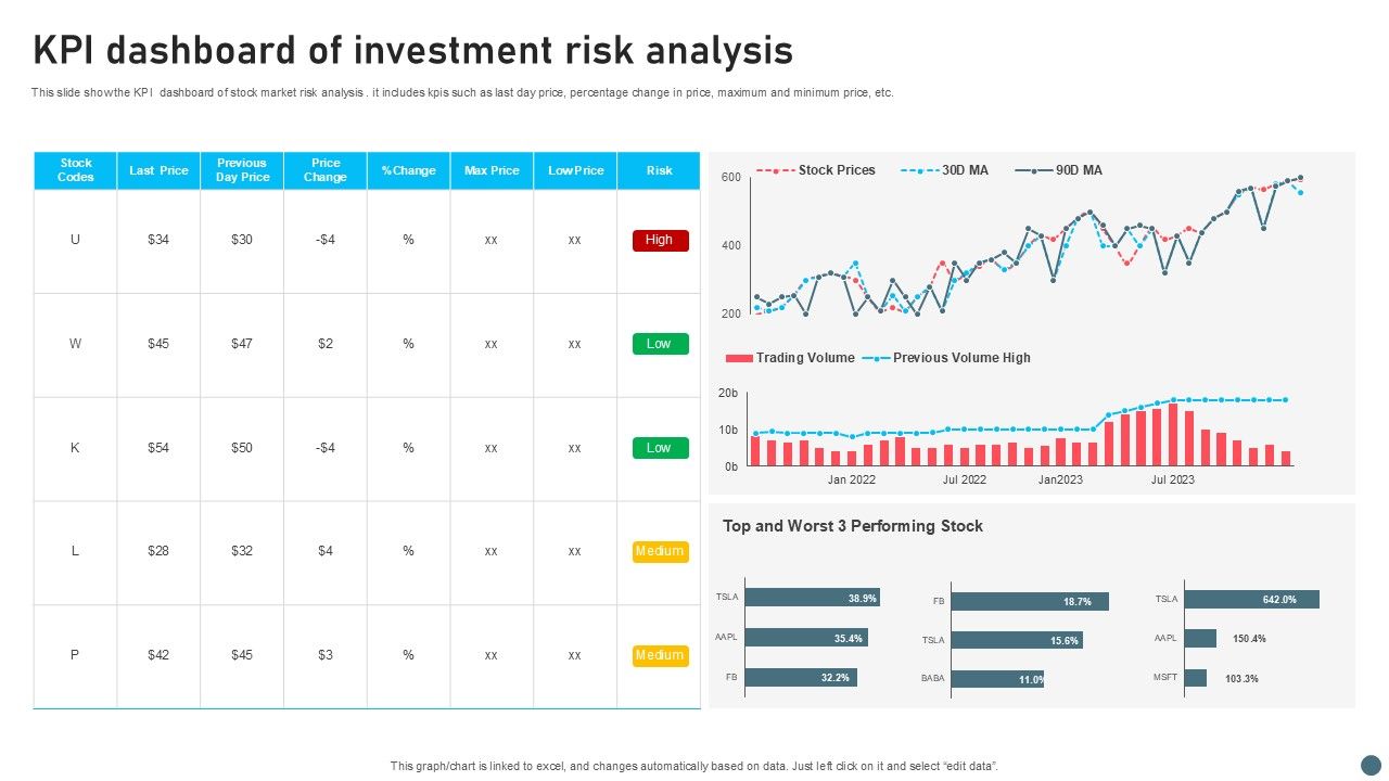 This slide show the KPI dashboard of stock market risk analysis . it includes kpis such as last day price, percentage change in price, maximum and minimum price, etc. Showcasing this set of slides titled Kpi Dashboard Of Investment Risk Analysis Introduction PDF. The topics addressed in these templates are Analysis, Dashboard, Investment. All the content presented in this PPT design is completely editable. Download it and make adjustments in color, background, font etc. as per your unique business setting.