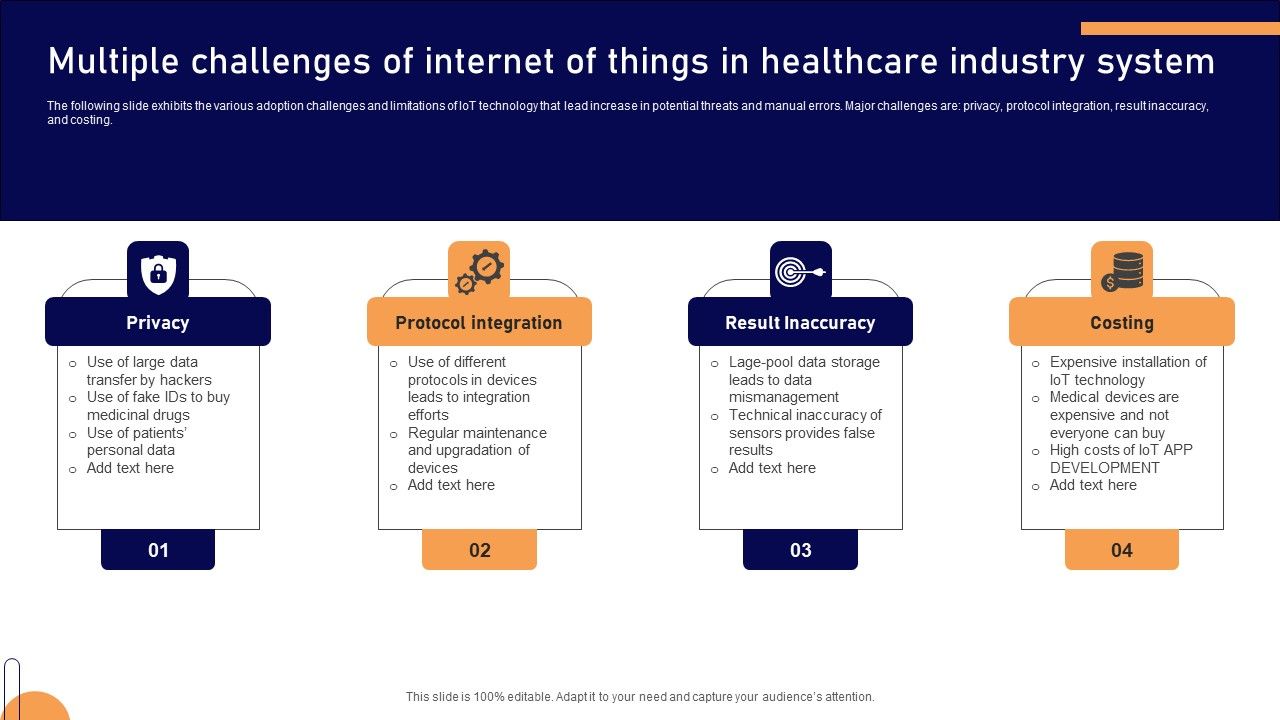 The following slide exhibits the various adoption challenges and limitations of IoT technology that lead increase in potential threats and manual errors. Major challenges are privacy, protocol integration, result inaccuracy, and costing. Persuade your audience using this Multiple Challenges Of Internet Of Things In Healthcare Industry System Slides PDF. This PPT design covers four stages, thus making it a great tool to use. It also caters to a variety of topics including Privacy, Protocol Integration, Result Inaccuracy, Costing. Download this PPT design now to present a convincing pitch that not only emphasizes the topic but also showcases your presentation skills.