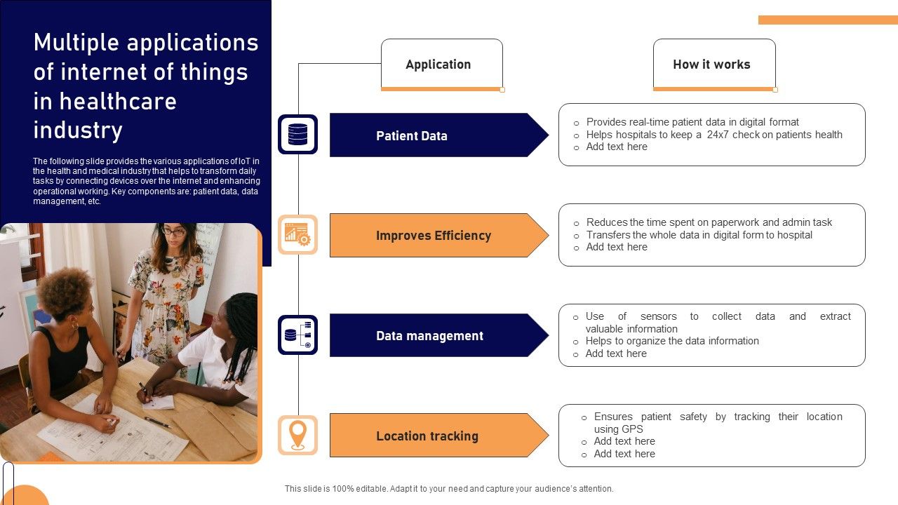 The following slide provides the various applications of IoT in the health and medical industry that helps to transform daily tasks by connecting devices over the internet and enhancing operational working. Key components are patient data, data management, etc. Presenting Multiple Applications Of Internet Of Things In Healthcare Industry Professional PDF to dispense important information. This template comprises four stages. It also presents valuable insights into the topics including Patient Data, Improves Efficiency, Data Management, Location Tracking. This is a completely customizable PowerPoint theme that can be put to use immediately. So, download it and address the topic impactfully.