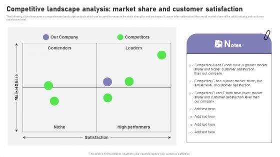 The following slide showcases a comprehensive landscape analysis which can be used to measure the rivals strengths and weakness. It covers information about the overall market share of the retail industry and customer satisfaction level. Create an editable Competitive Landscape Analysis Market Share And Customer Satisfaction Topics PDF that communicates your idea and engages your audience. Whether you are presenting a business or an educational presentation, pre designed presentation templates help save time. Competitive Landscape Analysis Market Share And Customer Satisfaction Topics PDF is highly customizable and very easy to edit, covering many different styles from creative to business presentations. Slidegeeks has creative team members who have crafted amazing templates. So, go and get them without any delay.