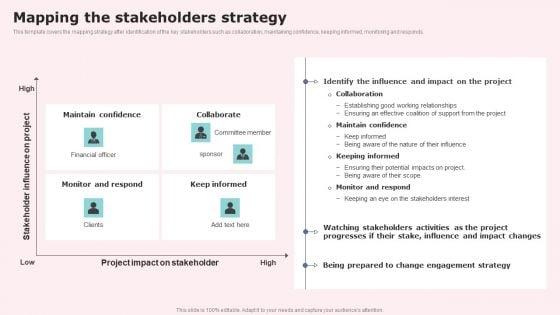 This template covers the mapping strategy after identification of the key stakeholders such as collaboration, maintaining confidence, keeping informed, monitoring and responds. Slidegeeks is here to make your presentations a breeze with Mapping The Stakeholders Strategy Ppt Infographic Template Clipart PDF With our easy to use and customizable templates, you can focus on delivering your ideas rather than worrying about formatting. With a variety of designs to choose from, you are sure to find one that suits your needs. And with animations and unique photos, illustrations, and fonts, you can make your presentation pop. So whether you are giving a sales pitch or presenting to the board, make sure to check out Slidegeeks first.