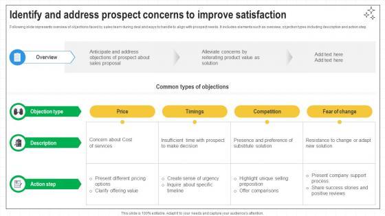 Following slide represents overview of objections faced by sales team during deal and ways to handle to align with prospect needs. It includes elements such as overview, objection types including description and action step. Formulating a presentation can take up a lot of effort and time, so the content and message should always be the primary focus. The visuals of the PowerPoint can enhance the presenters message, so our Closing Techniques To Seal Identify And Address Prospect Concerns To Improve SA SS V was created to help save time. Instead of worrying about the design, the presenter can concentrate on the message while our designers work on creating the ideal templates for whatever situation is needed. Slidegeeks has experts for everything from amazing designs to valuable content, we have put everything into Closing Techniques To Seal Identify And Address Prospect Concerns To Improve SA SS V. Following slide represents overview of objections faced by sales team during deal and ways to handle to align with prospect needs. It includes elements such as overview, objection types including description and action step.