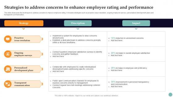 This slide showcases the techniques to address concerns to improve employee rating. It includes strategies such as proactive issue resolution, ongoing employee surveys, personalized development plans and transparent communication. Do you know about Slidesgeeks Strategies To Address Concerns Improving Employee Performance PPT Presentation Strategy SS V These are perfect for delivering any kind od presentation. Using it, create PowerPoint presentations that communicate your ideas and engage audiences. Save time and effort by using our pre-designed presentation templates that are perfect for a wide range of topic. Our vast selection of designs covers a range of styles, from creative to business, and are all highly customizable and easy to edit. Download as a PowerPoint template or use them as Google Slides themes. This slide showcases the techniques to address concerns to improve employee rating. It includes strategies such as proactive issue resolution, ongoing employee surveys, personalized development plans and transparent communication.