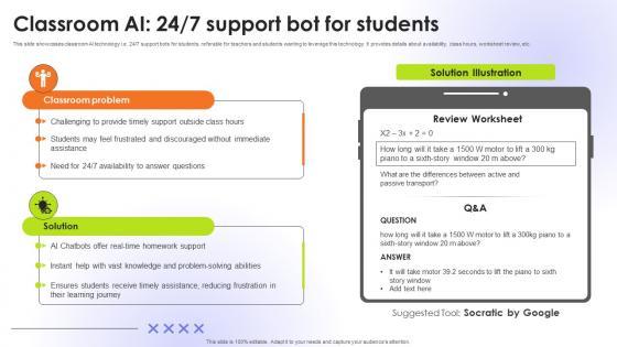 This slide showcases classroom AI technology i.e. 24x7 support bots for students, referable for teachers and students wanting to leverage this technology. It provides details about availability, class hours, worksheet review, etc. This modern and well-arranged Classroom AI 24 into 7 Support Bot For Students Educational Transformation Through AI SS V provides lots of creative possibilities. It is very simple to customize and edit with the Powerpoint Software. Just drag and drop your pictures into the shapes. All facets of this template can be edited with Powerpoint, no extra software is necessary. Add your own material, put your images in the places assigned for them, adjust the colors, and then you can show your slides to the world, with an animated slide included. This slide showcases classroom AI technology i.e. 24x7 support bots for students, referable for teachers and students wanting to leverage this technology. It provides details about availability, class hours, worksheet review, etc.