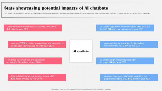 This slide showcases future impacts of AI based chatbots on different businesses. It highlights statistics related to chatbot market size, return on investment, cost saving, chatbot adoption rate, ecommerce chatbots etc. Do you have an important presentation coming up Are you looking for something that will make your presentation stand out from the rest Look no further than Stats Showcasing Potential Impacts Ai Bot Application For Various Industries Diagrams Pdf. With our professional designs, you can trust that your presentation will pop and make delivering it a smooth process. And with Slidegeeks, you can trust that your presentation will be unique and memorable. So why wait Grab Stats Showcasing Potential Impacts Ai Bot Application For Various Industries Diagrams Pdf today and make your presentation stand out from the rest This slide showcases future impacts of AI based chatbots on different businesses. It highlights statistics related to chatbot market size, return on investment, cost saving, chatbot adoption rate, ecommerce chatbots etc.