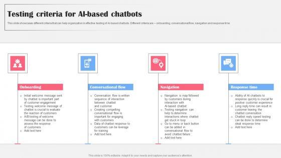 This slide showcases different criteria that can help organization in effective testing of AI based chatbots. Different criteria are onboarding, conversational flow, navigation and response time If you are looking for a format to display your unique thoughts, then the professionally designed Testing Criteria For Ai Based Chatbots Ai Bot Application For Various Industries Infographics Pdf is the one for you. You can use it as a Google Slides template or a PowerPoint template. Incorporate impressive visuals, symbols, images, and other charts. Modify or reorganize the text boxes as you desire. Experiment with shade schemes and font pairings. Alter, share or cooperate with other people on your work. Download Testing Criteria For Ai Based Chatbots Ai Bot Application For Various Industries Infographics Pdf and find out how to give a successful presentation. Present a perfect display to your team and make your presentation unforgettable. This slide showcases different criteria that can help organization in effective testing of AI based chatbots. Different criteria are onboarding, conversational flow, navigation and response time
