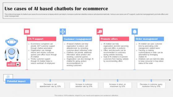 This slide showcases AI chatbot use cases for ecommerce company which can help to increase customer retention reduce cart abandonment rate. Various use cases are 4 7 support, customer reengagement, promote offers and order management Make sure to capture your audiences attention in your business displays with our gratis customizable Use Cases Of Ai Based Chatbots Ecommerce Ai Bot Application For Various Industries Designs Pdf. These are great for business strategies, office conferences, capital raising or task suggestions. If you desire to acquire more customers for your tech business and ensure they stay satisfied, create your own sales presentation with these plain slides. This slide showcases AI chatbot use cases for ecommerce company which can help to increase customer retention reduce cart abandonment rate. Various use cases are 4 7 support, customer reengagement, promote offers and order management