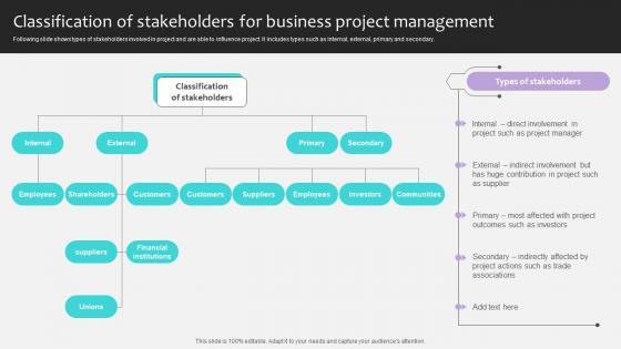 Following slide shows types of stakeholders involved in project and are able to influence project. It includes types such as internal, external, primary and secondary. There are so many reasons you need a Classification Of Stakeholders For Business Project Management Diagrams PDF. The first reason is you can not spend time making everything from scratch, Thus, Slidegeeks has made presentation templates for you too. You can easily download these templates from our website easily.
