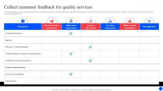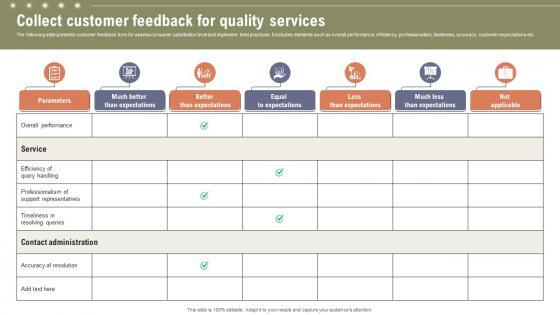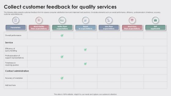 The following slide presents customer feedback form for assess consumer satisfaction level and implement best practices. It includes elements such as overall performance, efficiency, professionalism, timeliness, accuracy, customer expectations etc. Present like a pro with Collect Customer Feedback For Enhancing Customer Experience Ppt Example. Create beautiful presentations together with your team, using our easy-to-use presentation slides. Share your ideas in real-time and make changes on the fly by downloading our templates. So whether you are in the office, on the go, or in a remote location, you can stay in sync with your team and present your ideas with confidence. With Slidegeeks presentation got a whole lot easier. Grab these presentations today. The following slide presents customer feedback form for assess consumer satisfaction level and implement best practices. It includes elements such as overall performance, efficiency, professionalism, timeliness, accuracy, customer expectations etc.