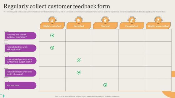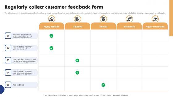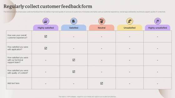 The following slide showcases customer feedback form to deliver improved quality of services to customers. It includes elements such as customer experience, overall app satisfaction, technical support, quality of content etc.The Regularly Collect Customer Feedback Form Evaluating Strengths And Weaknesses Portrait Pdf is a compilation of the most recent design trends as a series of slides. It is suitable for any subject or industry presentation, containing attractive visuals and photo spots for businesses to clearly express their messages. This template contains a variety of slides for the user to input data, such as structures to contrast two elements, bullet points, and slides for written information. Slidegeeks is prepared to create an impression. The following slide showcases customer feedback form to deliver improved quality of services to customers. It includes elements such as customer experience, overall app satisfaction, technical support, quality of content etc.
