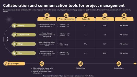 This slide showcases tools for collaborating while working on a project. This template focuses on building ability to track multiple projects and third party integrations. It includes information related to softwares such as Height, Miro, etc. Want to ace your presentation in front of a live audience Our Executing And Monitoring Project Collaboration And Communication Tools PM SS V can help you do that by engaging all the users towards you. Slidegeeks experts have put their efforts and expertise into creating these impeccable powerpoint presentations so that you can communicate your ideas clearly. Moreover, all the templates are customizable, and easy-to-edit and downloadable. Use these for both personal and commercial use. This slide showcases tools for collaborating while working on a project. This template focuses on building ability to track multiple projects and third party integrations. It includes information related to softwares such as Height, Miro, etc.