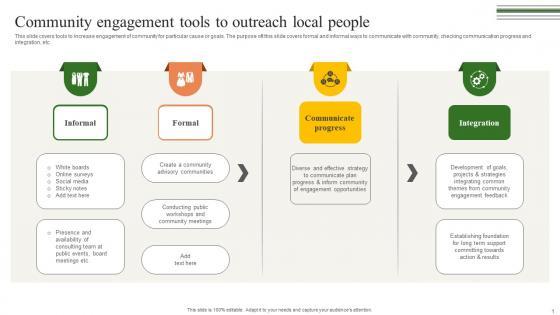 This slide covers tools to increase engagement of community for particular cause or goals. The purpose oft this slide covers formal and informal ways to communicate with community, checking communication progress and integration, etc. Do you have to make sure that everyone on your team knows about any specific topic I yes, then you should give Community Engagement Tools To Outreach Building A Winning Community Outreach Strategy SS V a try. Our experts have put a lot of knowledge and effort into creating this impeccable Community Engagement Tools To Outreach Building A Winning Community Outreach Strategy SS V. You can use this template for your upcoming presentations, as the slides are perfect to represent even the tiniest detail. You can download these templates from the Slidegeeks website and these are easy to edit. So grab these today This slide covers tools to increase engagement of community for particular cause or goals. The purpose oft this slide covers formal and informal ways to communicate with community, checking communication progress and integration, etc.