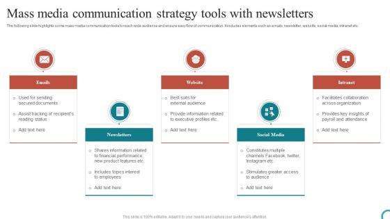 The following slide highlights some mass media communication tools to reach wide audience and ensure easy flow of communication. It includes elements such as emails, newsletter, website, social media, intranet etc. Showcasing this set of slides titled Mass Media Communication Strategy Tools With Newsletters Background Pdf. The topics addressed in these templates are Newsletters, Social Media, Website. All the content presented in this PPT design is completely editable. Download it and make adjustments in color, background, font etc. as per your unique business setting. The following slide highlights some mass media communication tools to reach wide audience and ensure easy flow of communication. It includes elements such as emails, newsletter, website, social media, intranet etc.