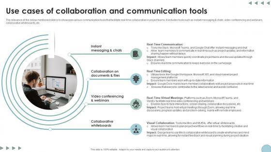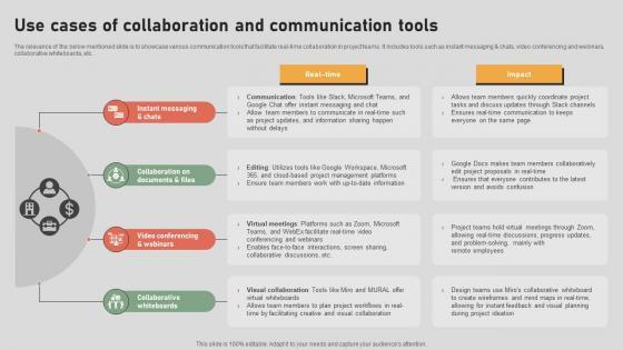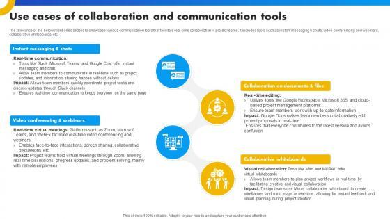 The relevance of the below mentioned slide is to showcase various communication tools that facilitate real-time collaboration in project teams. It includes tools such as instant messaging and chats, video conferencing and webinars, collaborative whiteboards, etc. Want to ace your presentation in front of a live audience Our Digital Project Management Strategies Use Cases Of Collaboration And Communication Tools can help you do that by engaging all the users towards you. Slidegeeks experts have put their efforts and expertise into creating these impeccable powerpoint presentations so that you can communicate your ideas clearly. Moreover, all the templates are customizable, and easy-to-edit and downloadable. Use these for both personal and commercial use. The relevance of the below mentioned slide is to showcase various communication tools that facilitate real-time collaboration in project teams. It includes tools such as instant messaging and chats, video conferencing and webinars, collaborative whiteboards, etc.
