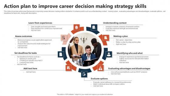 The slide showcase action plan that assist in improving career decision making skills in students. It contains points such as understanding context , making a plan , evaluating advantages and disadvantages , evaluate options , set deadlines for tasks etc. Along with description.Pitch your topic with ease and precision using this Action Plan To Improve Career Decision Making Strategy Skills Microsoft Pdf This layout presents information on Assess Outcomes, Understanding Context, Making A Plan It is also available for immediate download and adjustment. So, changes can be made in the color, design, graphics or any other component to create a unique layout. The slide showcase action plan that assist in improving career decision making skills in students. It contains points such as understanding context , making a plan , evaluating advantages and disadvantages , evaluate options , set deadlines for tasks etc. Along with description.