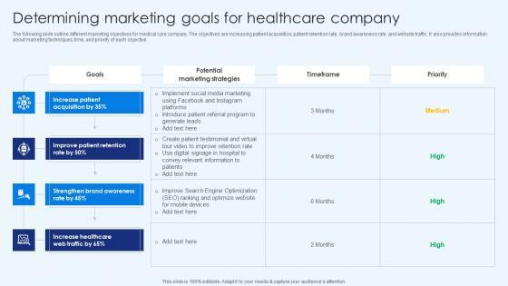 The following slide outline different marketing objectives for medical care company. The objectives are increasing patient acquisition, patient retention rate, brand awareness rate, and website traffic. It also provides information about marketing techniques, time, and priority of each objective. From laying roadmaps to briefing everything in detail, our templates are perfect for you. You can set the stage with your presentation slides. All you have to do is download these easy-to-edit and customizable templates. Determining Marketing Goals For Healthcare Company Healthcare Promotion Topics Pdf will help you deliver an outstanding performance that everyone would remember and praise you for. Do download this presentation today. The following slide outline different marketing objectives for medical care company. The objectives are increasing patient acquisition, patient retention rate, brand awareness rate, and website traffic. It also provides information about marketing techniques, time, and priority of each objective.