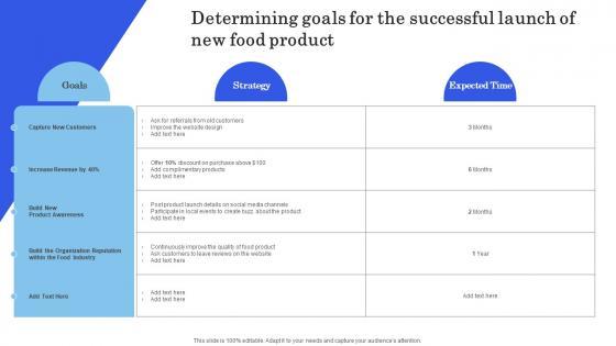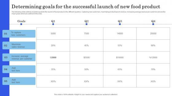 The following slide outlines projected goals for the launch of food product in the different quarters. Capturing new customers, maximizing product launch revenue, increasing average revenue per customer and are the major goals which are outlined in the slide. Slidegeeks is here to make your presentations a breeze with Launching New Commodity Determining Goals For The Successful Launch Of New Food Download Pdf With our easy-to-use and customizable templates, you can focus on delivering your ideas rather than worrying about formatting. With a variety of designs to choose from, you are sure to find one that suits your needs. And with animations and unique photos, illustrations, and fonts, you can make your presentation pop. So whether you are giving a sales pitch or presenting to the board, make sure to check out Slidegeeks first The following slide outlines projected goals for the launch of food product in the different quarters. Capturing new customers, maximizing product launch revenue, increasing average revenue per customer and are the major goals which are outlined in the slide.