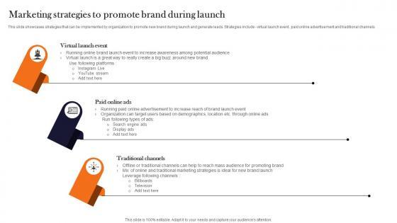 This slide showcases strategies that can be implemented by organization to promote new brand during launch and generate leads. Strategies include virtual launch event, paid online advertisement and traditional channels. Are you searching for a Marketing Strategies To Promote Brand During Product Advertising And Positioning Formats Pdf that is uncluttered, straightforward, and original Its easy to edit, and you can change the colors to suit your personal or business branding. For a presentation that expresses how much effort you have put in, this template is ideal With all of its features, including tables, diagrams, statistics, and lists, its perfect for a business plan presentation. Make your ideas more appealing with these professional slides. Download Marketing Strategies To Promote Brand During Product Advertising And Positioning Formats Pdf from Slidegeeks today. This slide showcases strategies that can be implemented by organization to promote new brand during launch and generate leads. Strategies include virtual launch event, paid online advertisement and traditional channels.