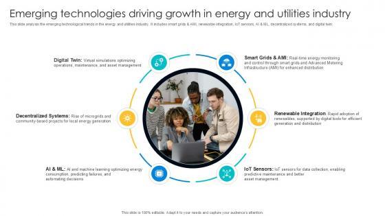 This slide analysis the emerging technological trends in the energy and utilities industry. It includes smart grids and AMI, renewable integration, IoT sensors, AI and ML, decentralized systems, and digital twin. Take your projects to the next level with our ultimate collection of Emerging Technologies Driving Growth Digital Transformation Journey PPT Slide DT SS V. Slidegeeks has designed a range of layouts that are perfect for representing task or activity duration, keeping track of all your deadlines at a glance. Tailor these designs to your exact needs and give them a truly corporate look with your own brand colors they will make your projects stand out from the rest This slide analysis the emerging technological trends in the energy and utilities industry. It includes smart grids and AMI, renewable integration, IoT sensors, AI and ML, decentralized systems, and digital twin.