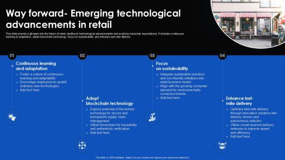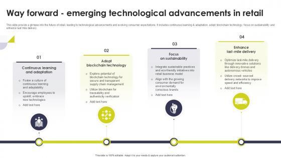 This slide provide a glimpse into the future of retail, leading to technological advancements and evolving consumer expectations. It includes continuous learning and adaptation, adopt blockchain technology, focus on sustainability and enhance last mile delivery. Explore a selection of the finest Way Forward Emerging Technological Advancements In Retail Way Forward Ppt Sample here. With a plethora of professionally designed and pre-made slide templates, you can quickly and easily find the right one for your upcoming presentation. You can use our Way Forward Emerging Technological Advancements In Retail Way Forward Ppt Sample to effectively convey your message to a wider audience. Slidegeeks has done a lot of research before preparing these presentation templates. The content can be personalized and the slides are highly editable. Grab templates today from Slidegeeks. This slide provide a glimpse into the future of retail, leading to technological advancements and evolving consumer expectations. It includes continuous learning and adaptation, adopt blockchain technology, focus on sustainability and enhance last mile delivery.