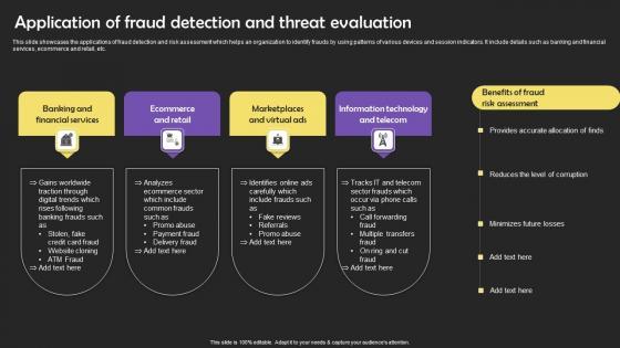 This slide showcases the applications of fraud detection and risk assessment which helps an organization to identify frauds by using patterns of various devices and session indicators. It include details such as banking and financial services, ecommerce and retail, etc. Pitch your topic with ease and precision using this Application Of Fraud Detection And Threat Evaluation Professional Pdf This layout presents information on Financial Services, Ecommerce And Retail, Information Technology It is also available for immediate download and adjustment. So, changes can be made in the color, design, graphics or any other component to create a unique layout. This slide showcases the applications of fraud detection and risk assessment which helps an organization to identify frauds by using patterns of various devices and session indicators. It include details such as banking and financial services, ecommerce and retail, etc.