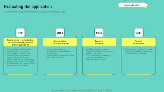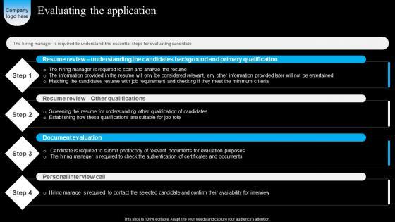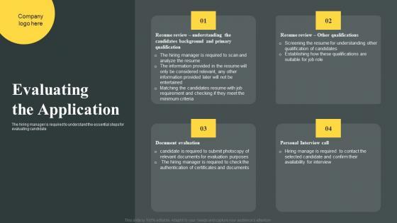 The hiring manager is required to understand the essential steps for evaluating candidate. Want to ace your presentation in front of a live audience Our Evaluating The Application Human Resources Hiring Guide Optimal Professional Pdf can help you do that by engaging all the users towards you. Slidegeeks experts have put their efforts and expertise into creating these impeccable powerpoint presentations so that you can communicate your ideas clearly. Moreover, all the templates are customizable, and easy-to-edit and downloadable. Use these for both personal and commercial use. The hiring manager is required to understand the essential steps for evaluating candidate.