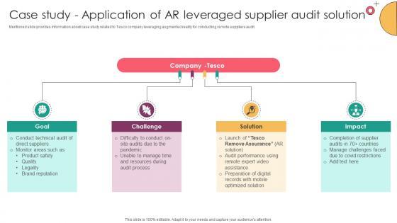 Mentioned slide provides information about case study related to Tesco company leveraging augmented reality for conducting remote suppliers audit. There are so many reasons you need a Strategic Supplier Evaluation Case Study Application Of AR Leveraged Supplier. The first reason is you can not spend time making everything from scratch, Thus, Slidegeeks has made presentation templates for you too. You can easily download these templates from our website easily. Mentioned slide provides information about case study related to Tesco company leveraging augmented reality for conducting remote suppliers audit.