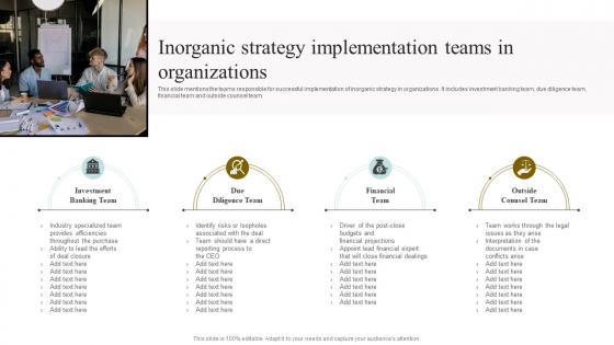 This slide mentions the teams responsible for successful implementation of inorganic strategy in organizations. It includes investment banking team, due diligence team, financial team and outside counsel team. Showcasing this set of slides titled Inorganic Strategy Implementation Teams In Organizations Structure Pdf. The topics addressed in these templates are Banking Team, Financial Team, Counsel Team. All the content presented in this PPT design is completely editable. Download it and make adjustments in color, background, font etc. as per your unique business setting. This slide mentions the teams responsible for successful implementation of inorganic strategy in organizations. It includes investment banking team, due diligence team, financial team and outside counsel team.