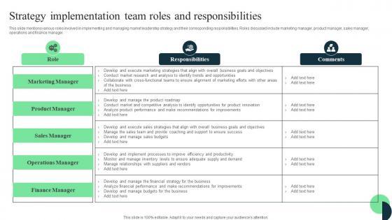 This slide mentions various roles involved in implementing and managing market leadership strategy and their corresponding responsibilities. Roles discussed include marketing manager, product manager, sales manager, operations and finance manager. Do you have an important presentation coming up Are you looking for something that will make your presentation stand out from the rest Look no further than Enterprise Leaders Technique To Achieve Market Control Strategy Implementation Team Roles And Responsibilities Formats PDF. With our professional designs, you can trust that your presentation will pop and make delivering it a smooth process. And with Slidegeeks, you can trust that your presentation will be unique and memorable. So why wait Grab Enterprise Leaders Technique To Achieve Market Control Strategy Implementation Team Roles And Responsibilities Formats PDF today and make your presentation stand out from the rest.