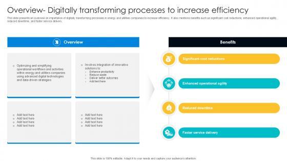 This Significant Cost Reductions, Enhanced Operational Agility, Reduced Downtime is perfect for any presentation, be it in front of clients or colleagues. It is a versatile and stylish solution for organizing your meetings. The Significant Cost Reductions, Enhanced Operational Agility, Reduced Downtime features a modern design for your presentation meetings. The adjustable and customizable slides provide unlimited possibilities for acing up your presentation. Slidegeeks has done all the homework before launching the product for you. So, do not wait, grab the presentation templates today This slide presents an overview on importance of digitally transforming processes in energy and utilities companies to increase efficiency. It also mentions benefits such as significant cost reductions, enhanced operational agility, reduced downtime, and faster service delivery.