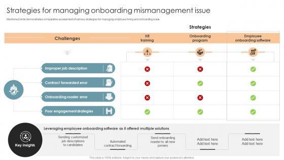 Mentioned slide demonstrates comparative assessment of various strategies for managing employee hiring and onboarding issue. Retrieve professionally designed Strategies For Managing Onboarding Mismanagement Office Process Optimization To Increase Cost Efficiency to effectively convey your message and captivate your listeners. Save time by selecting pre-made slideshows that are appropriate for various topics, from business to educational purposes. These themes come in many different styles, from creative to corporate, and all of them are easily adjustable and can be edited quickly. Access them as PowerPoint templates or as Google Slides themes. You do not have to go on a hunt for the perfect presentation because Slidegeeks got you covered from everywhere. Mentioned slide demonstrates comparative assessment of various strategies for managing employee hiring and onboarding issue.