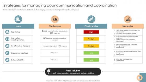 Mentioned slide provides information about strategies for managing communication challenges with respective priority status.Slidegeeks has constructed Strategies For Managing Poor Communication And Office Process Optimization To Increase Cost Efficiency after conducting extensive research and examination. These presentation templates are constantly being generated and modified based on user preferences and critiques from editors. Here, you will find the most attractive templates for a range of purposes while taking into account ratings and remarks from users regarding the content. This is an excellent jumping-off point to explore our content and will give new users an insight into our top-notch PowerPoint Templates. Mentioned slide provides information about strategies for managing communication challenges with respective priority status.