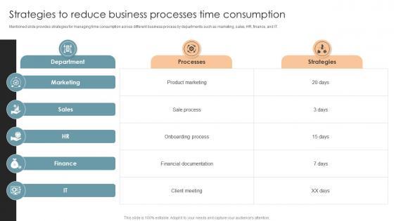 Mentioned slide provides strategies for managing time consumption across different business process by departments such as marketing, sales, HR, finance, and IT.Presenting this PowerPoint presentation, titled Strategies To Reduce Business Processes Time Office Process Optimization To Increase Cost Efficiency, with topics curated by our researchers after extensive research. This editable presentation is available for immediate download and provides attractive features when used. Download now and captivate your audience. Presenting this Strategies To Reduce Business Processes Time Office Process Optimization To Increase Cost Efficiency. Our researchers have carefully researched and created these slides with all aspects taken into consideration. This is a completely customizable Strategies To Reduce Business Processes Time Office Process Optimization To Increase Cost Efficiency that is available for immediate downloading. Download now and make an impact on your audience. Highlight the attractive features available with our PPTs. Mentioned slide provides strategies for managing time consumption across different business process by departments such as marketing, sales, HR, finance, and IT.